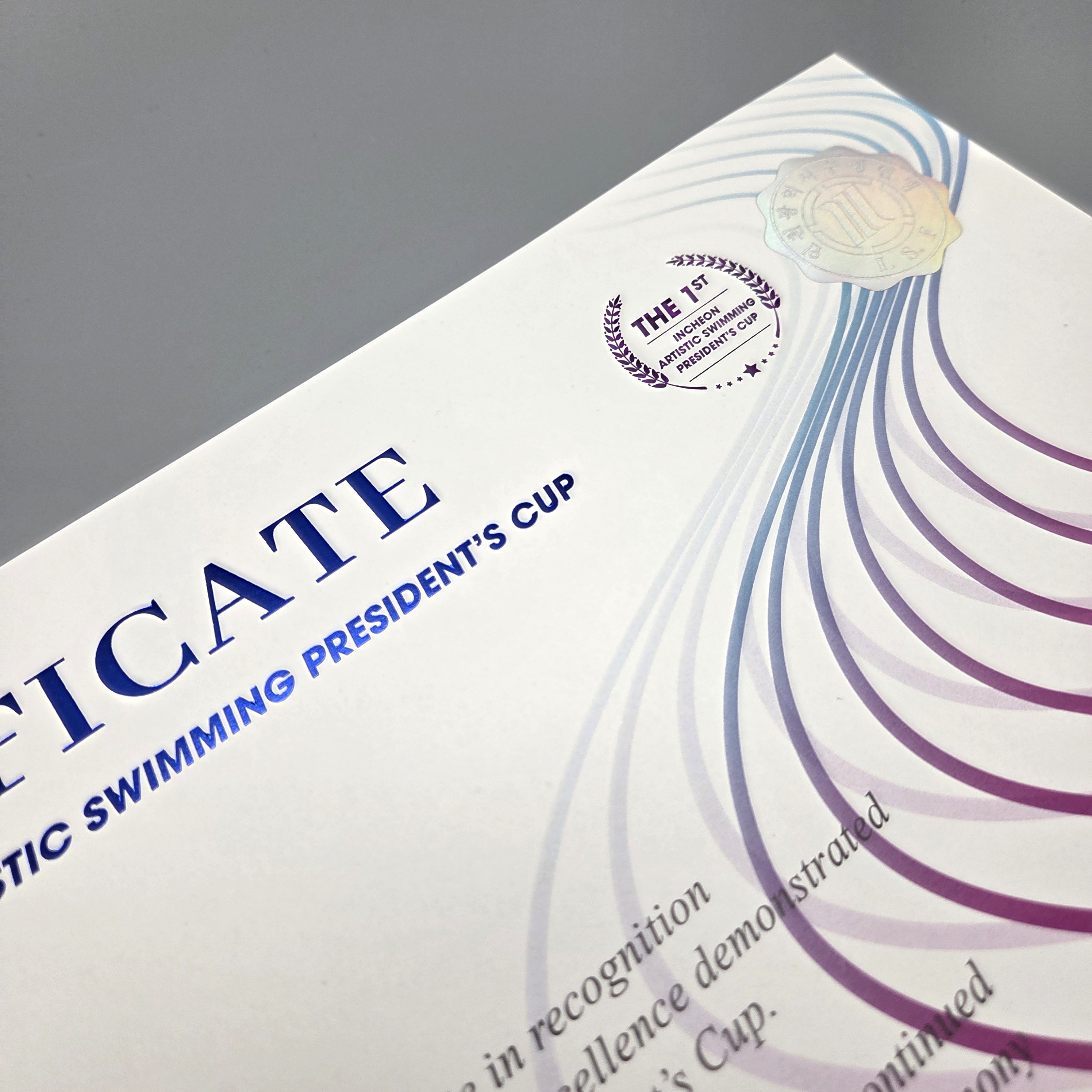 프라임용지 칼라인쇄 텍스트청박 압인은홀로그램박 퍼플유리홀로그램박 대회상장
