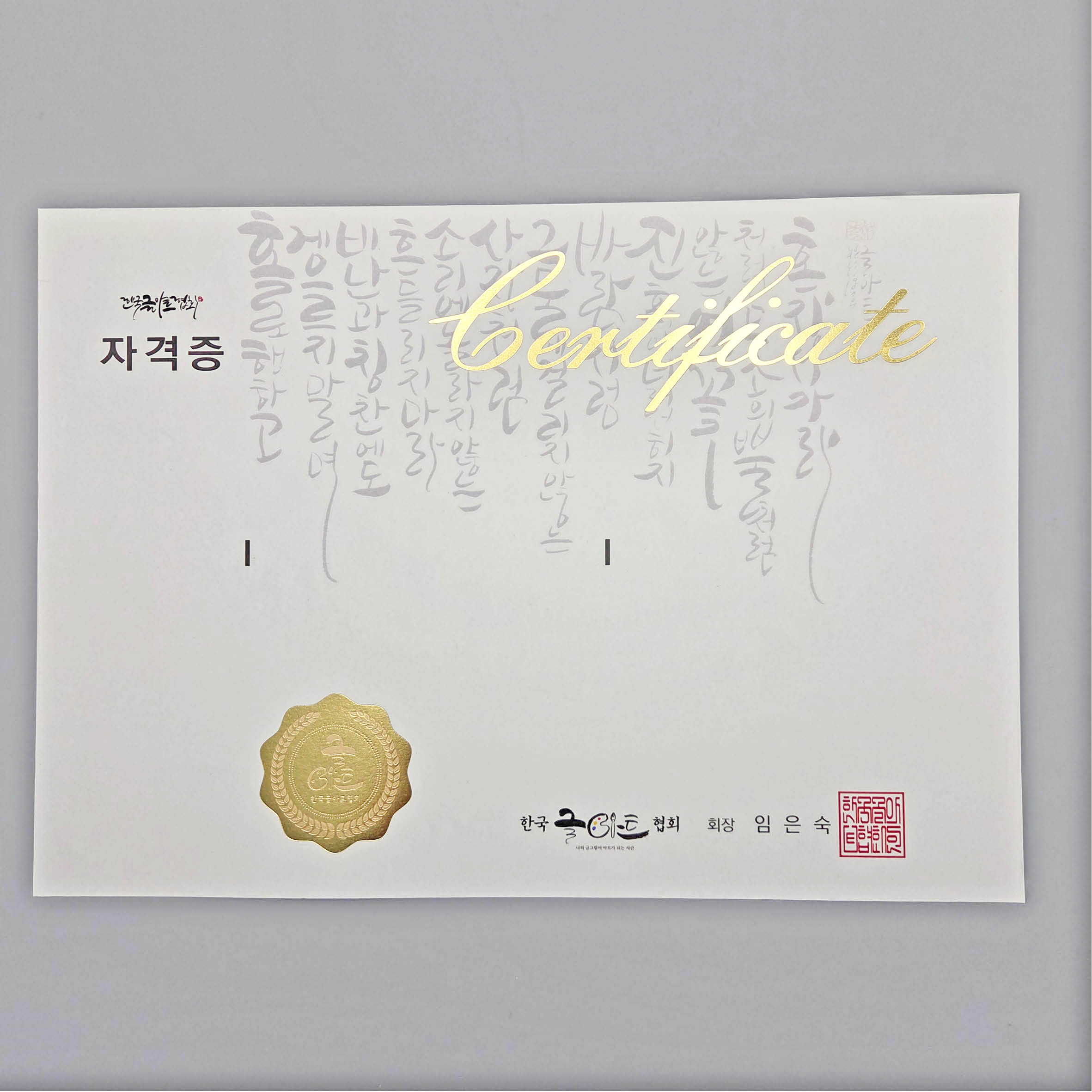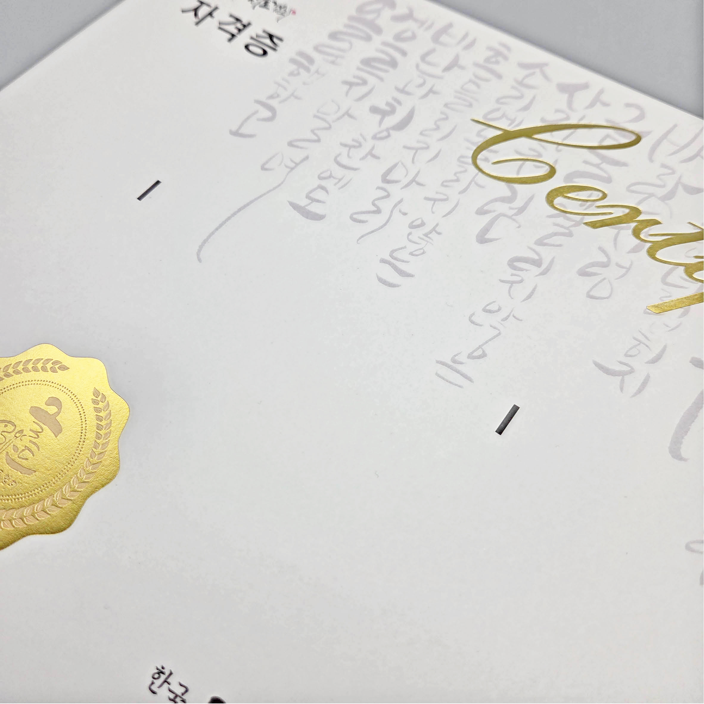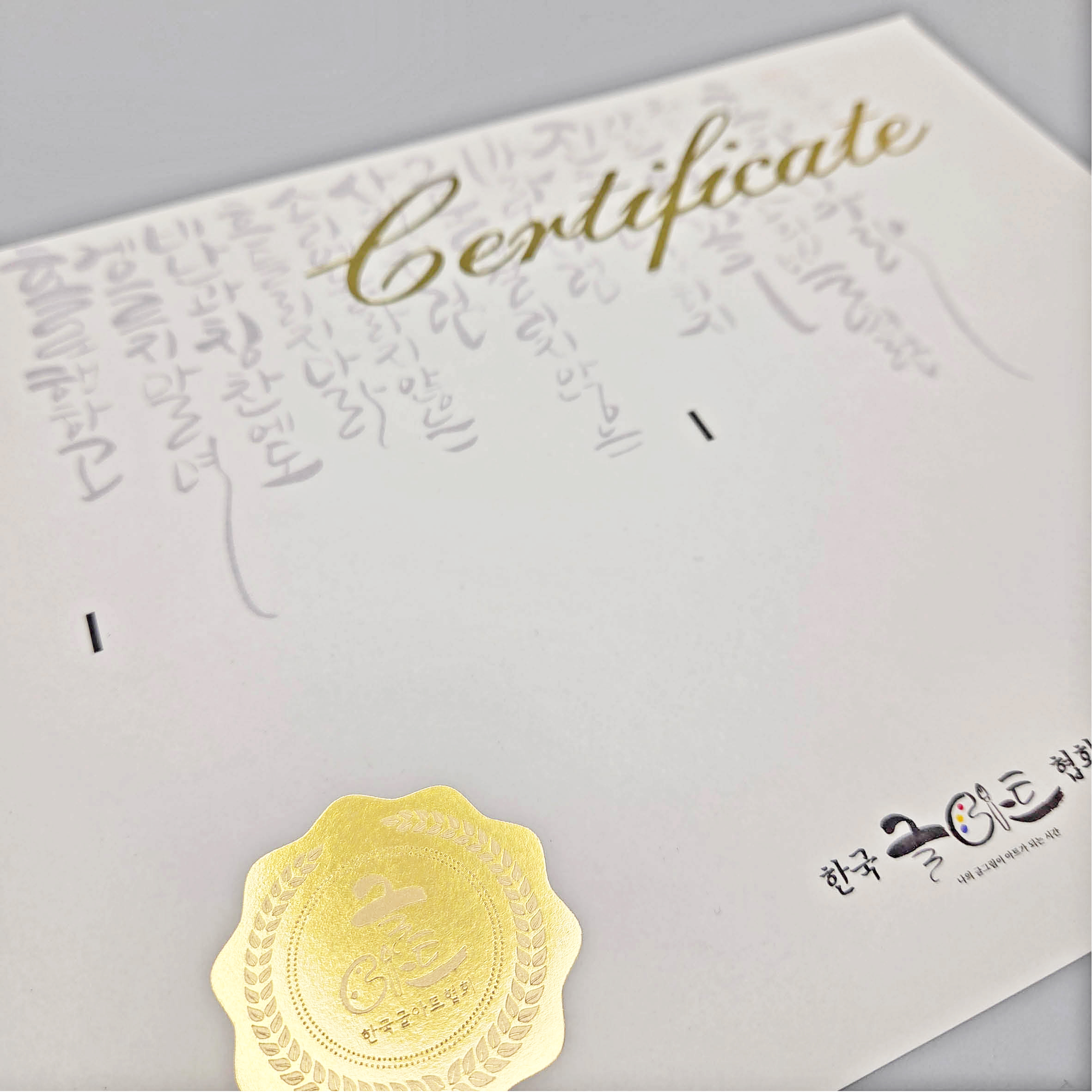 프라임용지 칼라인쇄 텍스트금박인쇄, 로고금박+로즈골드박인쇄 자격증